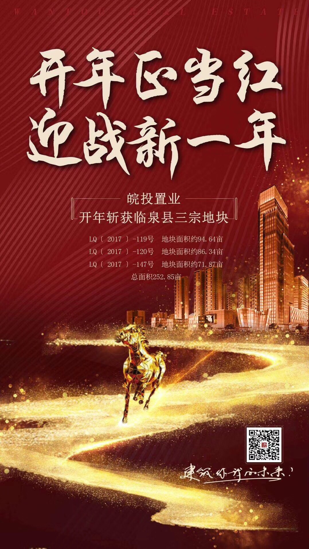 2018年1月2日下午,皖投置業(yè)成功競(jìng)得臨泉縣LQ〔2017〕-119號(hào)地塊,面積為94.64畝;LQ〔2017〕-120號(hào)地塊,面積為86.34畝;LQ〔2017〕-147號(hào)地塊,面積為71.87畝。合計(jì)總面積252.85畝。