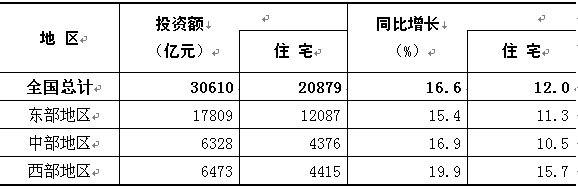 1-6月份,東部地區(qū)房地產(chǎn)開(kāi)發(fā)投資17809億元,同比增長(zhǎng)15.4%,增速比1-5月份回落0.6個(gè)百分點(diǎn);中部地區(qū)房地產(chǎn)開(kāi)發(fā)投資6328億元,增長(zhǎng)16.9%,增速回落5.4個(gè)百分點(diǎn);西部地區(qū)房地產(chǎn)開(kāi) 發(fā)投資6473億元,增長(zhǎng)19.9%,增速回落2.6個(gè)百分點(diǎn)。