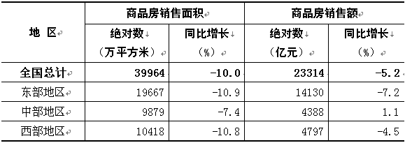 1-6月份,東部地區(qū)商品房銷售面積19667萬(wàn)平方米,同比下降10.9%,降幅比1-5月份縮小3.2個(gè)百分點(diǎn);銷售額14130億元,下降7.2%,降幅縮小4.9個(gè)百分點(diǎn)。中部地區(qū)商品房銷售面積9879萬(wàn)平方米,下降7.4%,降幅縮小2.8個(gè)百分點(diǎn);銷售額4388億元,增長(zhǎng)1.1%,1-5月份為下降2.9%。西部地區(qū)商品房銷售面積10418萬(wàn)平方米,下降10.8%,降幅縮小0.3個(gè)百分點(diǎn);銷售額4797億元,下降4.5%,降幅縮小0.5個(gè)百分點(diǎn)。