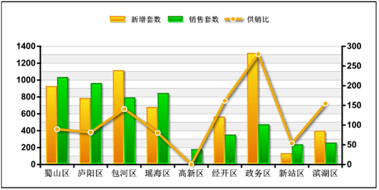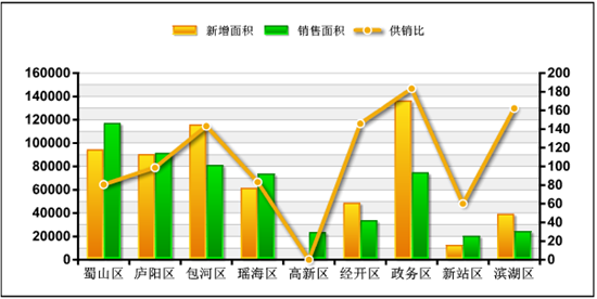 4月份期間高新區(qū)沒有新增住宅類商品房,而其他各區(qū)的新增量均保持較高的狀況,其中有六區(qū)的新增量是超過了500套,而且包河區(qū)和政務(wù)區(qū)的新增量超過了1000套,蜀山區(qū)的新增量也接近于1000套。本月期間多區(qū)新增量出現(xiàn)上漲的主要原因是由于本月期間有大量新增項(xiàng)目的影響,而本月期間大部分區(qū)屬的供銷狀況呈現(xiàn)了供小于求的局面,只有包河區(qū)、經(jīng)開區(qū)、政務(wù)區(qū)和濱湖區(qū)受到了大量新增項(xiàng)目的影響是呈現(xiàn)供大于求的局面。