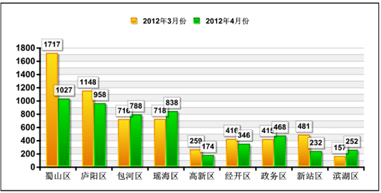 區(qū)屬2012年3月份2012年4月份環(huán)比蜀山區(qū)17171027-40.19%廬陽區(qū)1148958-16.55%包河區(qū)71678810.06%瑤海區(qū)71883816.71%高新區(qū)259174-32.82%經(jīng)開區(qū)416346-16.83%政務(wù)區(qū)41546812.77%新站區(qū)481232-51.77%濱湖區(qū)15725260.51% 2012年4月份區(qū)屬住宅銷售量及環(huán)比變化表