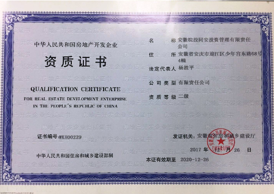 2018年1月2日,安徽省住建廳傳來喜訊,經(jīng)過市住建委和省住建廳審核,皖投同安公司成功晉升為房地產(chǎn)開發(fā)二級(jí)資質(zhì)企業(yè)。