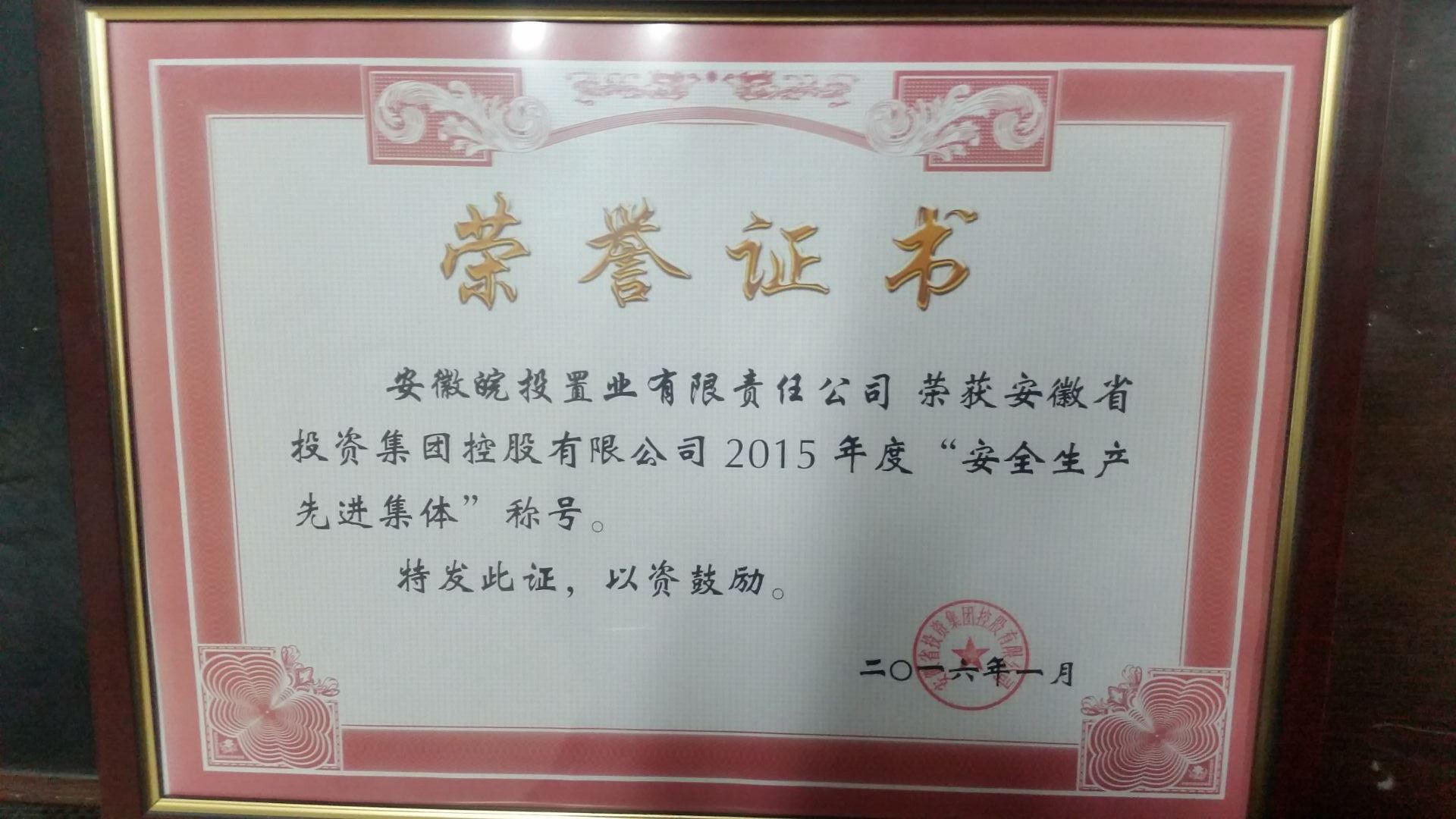 2016年1月28日,公司榮獲集團(tuán)公司“安全生產(chǎn)先進(jìn)集體”稱號(hào)。