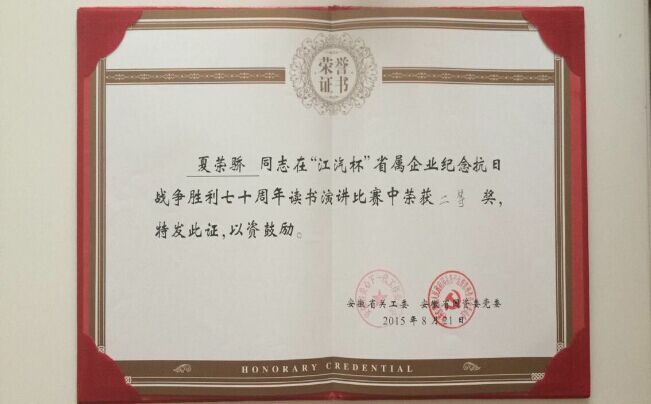 2015年8月21日,由省關(guān)工委、省國(guó)資委黨委、省國(guó)資委關(guān)工委聯(lián)合舉辦的大型演講比賽在江汽集團(tuán)研發(fā)中心隆重舉行,三十余家省國(guó)資企業(yè)參賽,經(jīng)過激烈角逐,代表我司及集團(tuán)公司參賽的夏榮驕同志以一篇《回憶里選擇未來》打動(dòng)了評(píng)委及現(xiàn)場(chǎng)觀眾,獲得評(píng)委高度贊揚(yáng)并榮獲二等獎(jiǎng),充分展示了國(guó)企員工的風(fēng)采,為集團(tuán)公司和我司爭(zhēng)得了榮譽(yù)。