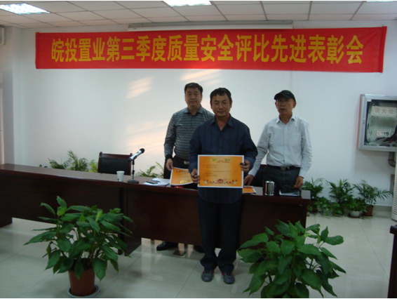 2012年10月15日下午,項(xiàng)目管理總監(jiān)丁昌華在公司會議一室主持召開了2012年三季度質(zhì)量安全評比表彰會,工程管理部,皖投置業(yè)各項(xiàng)目部、施工單位、監(jiān)理單位的項(xiàng)目負(fù)責(zé)人及相關(guān)人員參加。