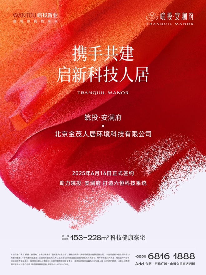 2025年6月16日,皖投置業(yè)公司旗下項目——皖投·安瀾府,與北京金茂人居環(huán)境科技有限公司就“科技系統(tǒng)”的引入與應用正式簽約。此次合作旨在為業(yè)主提供更加舒適、健康、節(jié)能的居住體驗。